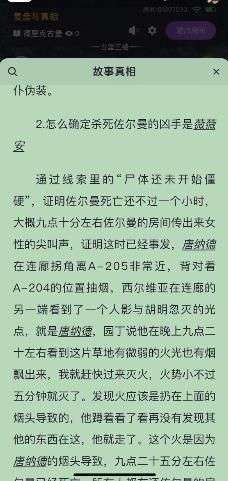 1.怎么推出杀死佐尔曼的凶器之谜根据女仆的证词佐尔曼在尖叫后像是被拽出去了一般撞向了花箱,佐尔曼尸体脖子上有勒痕,有一条绳子从A-203的上方杂物间的窗户伸出来,吊在佐尔曼房间的窗户上方,杂物间在佐尔曼房间的正上方,以及窗户顶部的墙体有磨损可以推出佐尔曼是被绳子拽出去撞向花箱,撞断了脊柱。为什么尸体附近没有绳子,是因为凶手设置了机关,古堡里有许多可遥控设施,收绳机的遥控器不在了,证明佐尔曼的死亡应该与收绳机相关,绳子在佐尔曼脖子上的结能被解开收走就是因为凶手将鱼线系在绳子上两个收绳机相对转的时候,可以保证将佐尔曼拽向花箱的同时将套在脖子上的活结解开。所以收绳机是转向相对,一台机器收着鱼线,另一台机器收着绳子,绳子与鱼线系在一起。