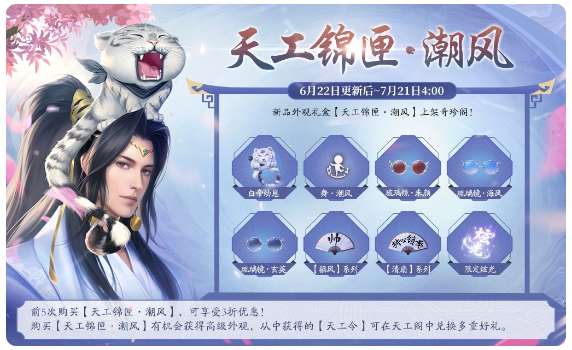 2.活动内容:奇珍阁上架全新天工锦匣·潮风。少侠可在奇珍阁消耗翠玉购买锦匣,开启后将随机获得限定外观。