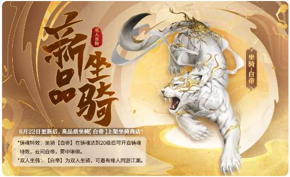 长啸万里风,一怒山海倾,诚邀少侠共乘猛虎,畅游尘世,更有精美外观、全新舞蹈动作上新,超可爱萌虎头饰带你萌动江湖!明早更新维护后与大家相见,敬请期待~具体更新内容如下。