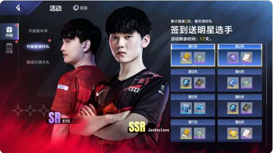 不删档上线后还有更多精彩福利活动, SSR疯狂送,银河战队不是梦!签到就可以领取强力SSR选手,累计签到8天,即可获得SR(Yagao、FoFo、xiye任选其一)和SSR(Photic、GALA、JackeyLove、Light、Lwx任选其一)选手各一名;完成6元首充即可获得SSR辅助一名(Ming、Mark、Missing、Meiko、Crisp任选其一)。