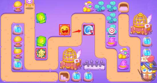 1、首先我们把瓶子炮都升到二级,然后使用下面的瓶子炮打掉魔法帽,最后带护甲的兔子我们需要让两个炮塔一起攻击。