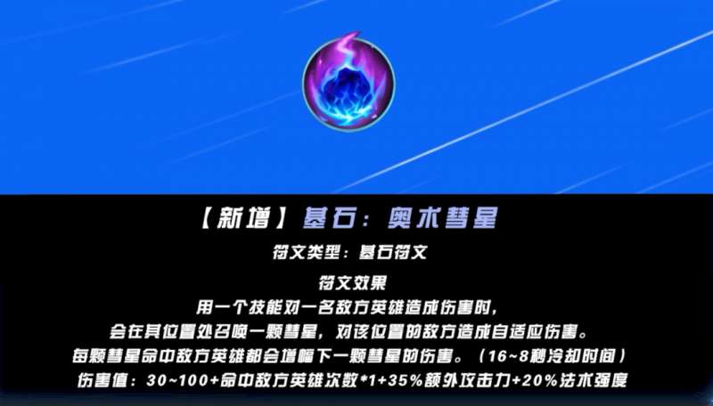 彗星的伤害值为30到100,随等级提升。加一乘层数再加35%额外攻击力,加20%法强。所以就是说每层都会增加1点彗星伤害,这个提升还是比较小的。一把叠50层也才加50点伤害,那么这个符文在伤害性符文中处于什么地位呢?
