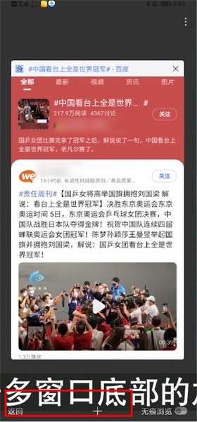 3、如果用户想新增窗口,点击多窗口底部的加号,再次搜索内容,进入网页后,点击下方的三条横线,选择多窗口,这样便能快速查看所有需要浏览的网页了。点击下方“返回”,用户便可以退出多窗口。