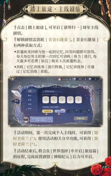1、进入[踏上旅途],消耗[青金石能量]开启周年主线剧情。活动期间第一次完成个人主线和使用活动分享功能,均可获得[限时老荷兰]*1。