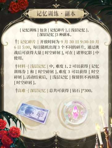 3、[记忆训练]分为材料本[记忆碎片][浅层记忆]、高难本[深层记忆]。参与[深层记忆]累计可得[钻石]*300。