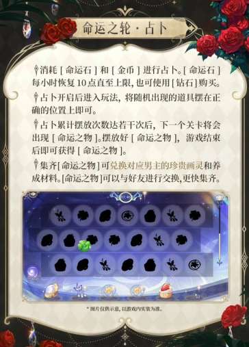 2、消耗[命运石]和[金币]开启[命运之轮],收集[命运之物]兑换男主珍贵画灵和养成材料。