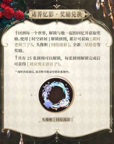 4、在[诸界忆影]中使用[时空碎屑]解锁与他一起的回忆,可获取[限时老荷兰]*5、限定头像框、全新二星绘卷、个人档案、[男主·语音]*25、[R卡特技突破证]*25等奖励。