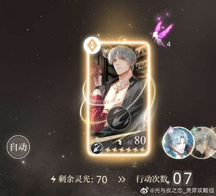 [默认效果] :首次和第三次行动时可召唤1只精灵,使自身及后续四张灵犀中的同男主灵犀伤害提升,四星铭记达到24%。战斗中同时最多出现1只精灵。