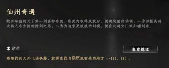 解密一:炎鸿铸剑。首先我们来到云潇山庄,到处逛逛就触发了第一个剧情,有人说金麟客得到了一块石头,可以打造神兵。然后我们去找那个人,金鳞客就在云潇山庄门口的路边(702,565),找到他之后会给你石头:琉薪岩,这是一个线索,然后拿着他我们去找云潇山庄的铁匠铺老板(795,436),他会告诉你一个证词。然后在小镇到处互动一下NPC,反正一共有四个证词。然后在云潇山庄的山上,(地图可以检索NPC),有一个燕××,靠近后触发剧情,他要抢你的琉薪岩,把他揍了得到一把宝剑,我们得知这就是郁命疏的宝剑。整合线索,推理成功之后,根据提示,我们继续找铁匠铺老板(795,436),他替我们重铸宝剑:阳焱。到这里送了一把剑,而且这还只是仙州奇遇的前置。