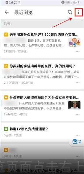 3、在最近浏览页面,点击右上方的三点标志;