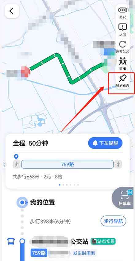 3、接着进入公交详情后,在右上方可以看到钉到首页选项,点击就能成功钉到首页,如下图所示。