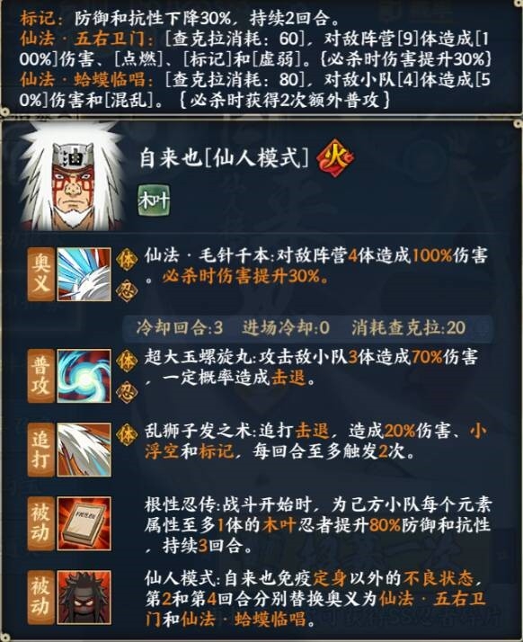 根据自来也【仙人模式】的核心技能“根性忍传”,可以大概确定该忍者的搭配思路。