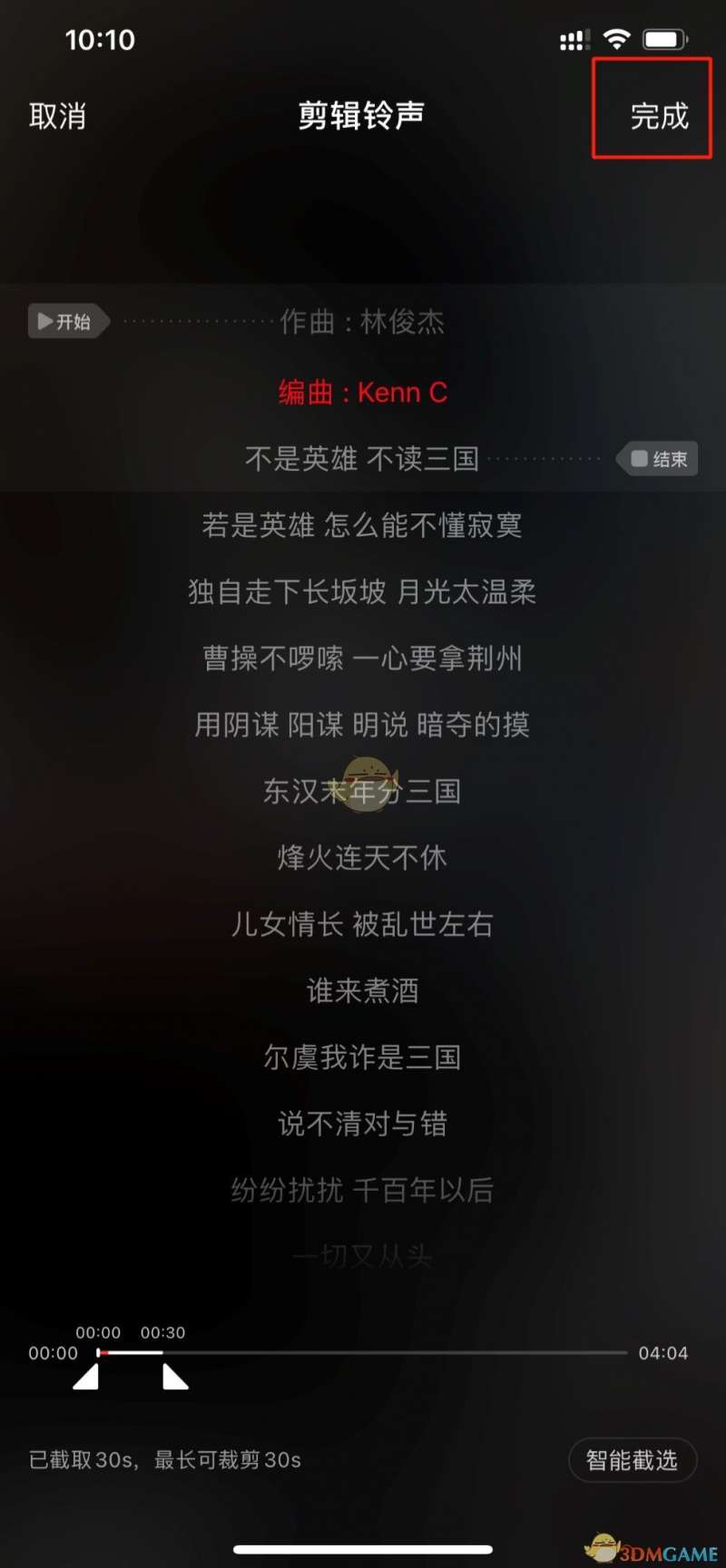 4、在剪辑铃声界面中,截取想要的铃声,点击右上角完成。