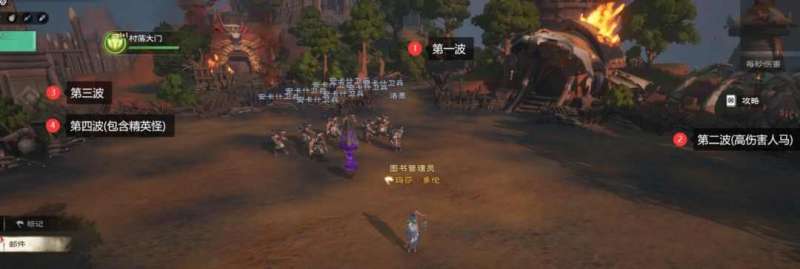 如下图,会按照序号位置依次出现四波小怪,此阶段,坦克职业需要提前去小怪刷新点就位并第一时间使用范围群体嘲讽技能,输出职业全力打小怪,治疗职业需治疗坦克和被技能点名的DPS队友