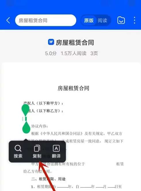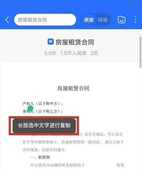 需要的文档页面, 根据提示长按选中需要复制的内容。