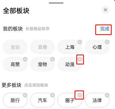 2、然后,根据需要点×删除板块,点加号添加板块。
