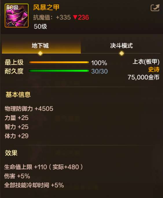 1.装备介绍 「风暴之甲」 Lv.50 板甲 - 史诗 -上衣 获取方式:制作、委托、深渊派对、道具 2.属性效果 【基本信息】 抗魔值:+335 物理防御力 +4505 力量+25 智力+25 体力+29 【效果】 ① 生命值上限+110(实际+480) ② 伤害+5% ③ (负面效果)全部技能冷却时间+5%
