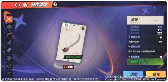 - 所有秘宝部位的强化等级都满足条件时,航海秘宝的共鸣等级将提升,解锁独特的共鸣效果,同时开启下一阶段的强化等级。