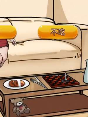 2、来到客厅后我们用叉子将盘子里的食物划开发现新的规则,这时出现吃还是不吃的选项我们不要选择将桌子上的请巧克力酱倒在食物上就行。