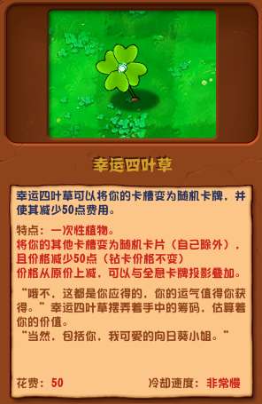 以上就是关于植物大战僵尸杂交版幸运四叶草有什么用的所有攻略分享了,希望对每一位小伙伴都可以带来帮助哦,觉得本站攻略不错的小伙伴可以关注一下,每天为您带来最新的资讯哦。