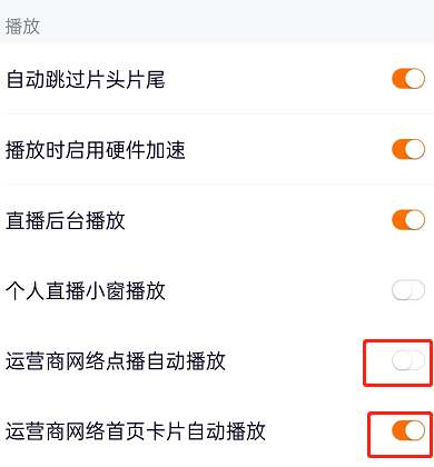 3、将运营商网络点拨自动播放、运营商网络首页卡片自动播放都关闭即可。