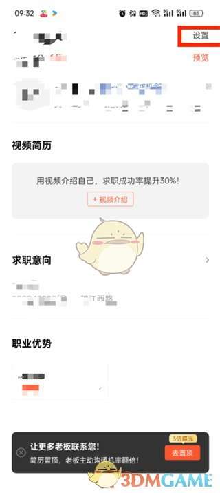 3、接着来到我的简历的页面中我们需要点击右上角的【设置】;