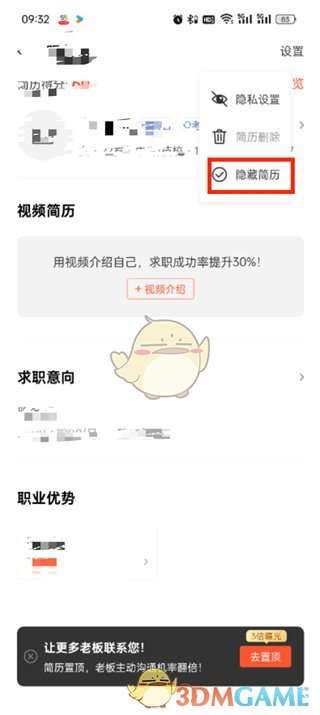 4、最后在页面中会弹出三个选项,在这里我们点击其中的【隐藏简历】即可。