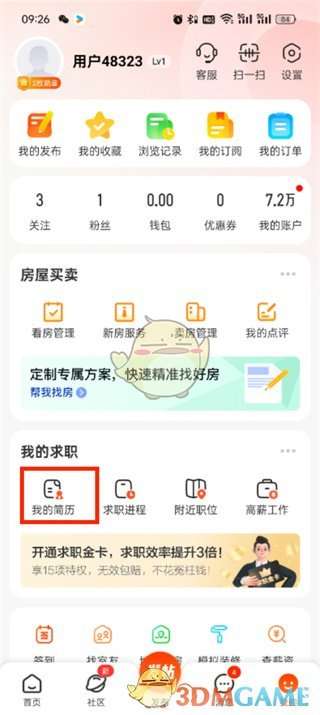 2、然后在我的页面中可以可以看到有我的简历、求职进程、附近职位、高薪工作,我们点击【我的简历】;