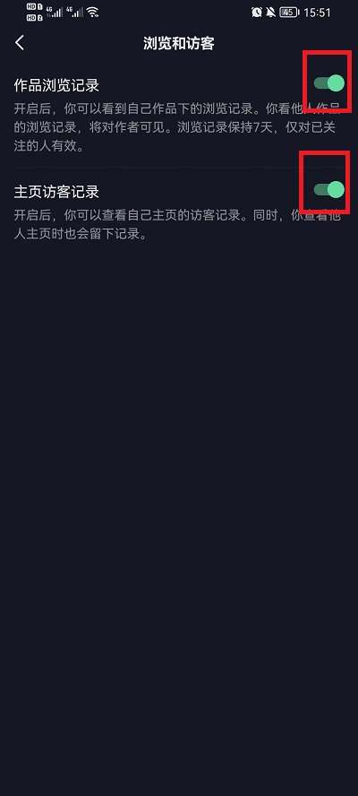 5、最后,将作品浏览记录、主页访客记录右侧开关关闭即可。