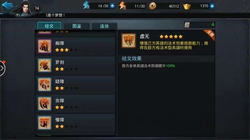 经文选择目前就只有这三个是实用性最强的,其他的经文虽然也可以使用,但是在升级之后的性能是完全比不过这三个的。由于大家玩的阵容法系偏多,所以小编建议使用净土+法华的组合。这样一来,我们的续航能力和法术输出都会得到增加,在完成一些难度较高的副本的时候,这个经文组合的实战效果会更出色。但是通过你玩的是物理攻击的话,就可以考虑换成净土+罗汉经文的组合。