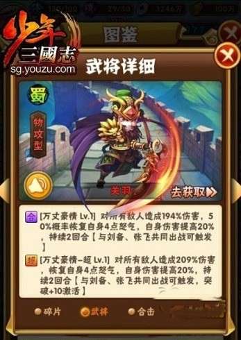 在《少年三国志》中,关羽是被广大玩家所熟知与推崇的武将之一。他的形象通常与忠义、勇猛挂钩,这也得到了完美的体现。关羽的技能很大程度上能够在战场上稳定输出高额伤害,尤其适合突破敌人的防线,消灭重要目标。再配上另外一位红将,这样的组合就形成了双红将阵容。