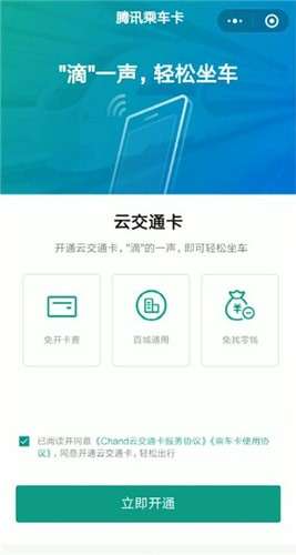 2、然后搜索腾讯乘车卡,选中该小程序并且点击立即开通,如下图所示。