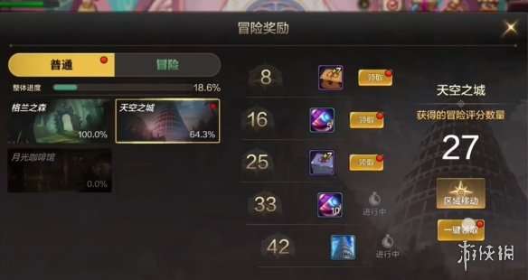 3、等级高了以后呢,就可以分解掉 4、目前手游难度不高,任意武器都能满足刷图的刚需。 冒险奖励保驾护航 1、在手游界面的右下角,有个冒险的选项,里面有冒险奖励的成就奖励系统。