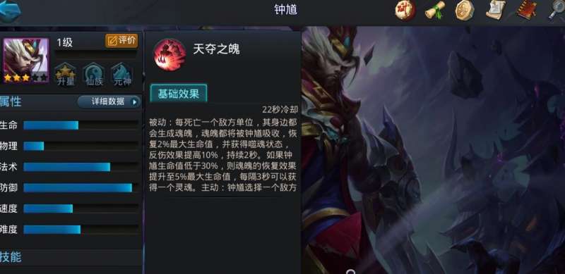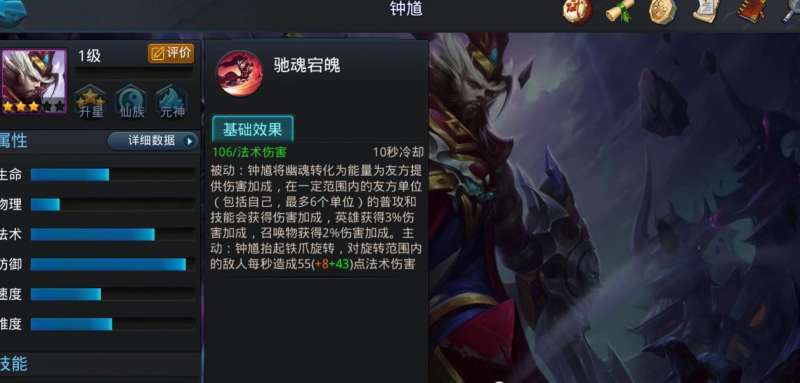 钟馗一技能附带有致盲效果,能够让敌人命中率降低,二技能则是强制位移技能,大招可压制敌方三秒钟。从以上的技能就能看出,他是个非常全面的辅助角色,不但可作为队伍的开团点,而且还具有很高的输出。在排行榜的挑战玩法中,钟馗的表现非常好,虽然只有三星,但是实战效果却完全不弱于一些四星的辅助。