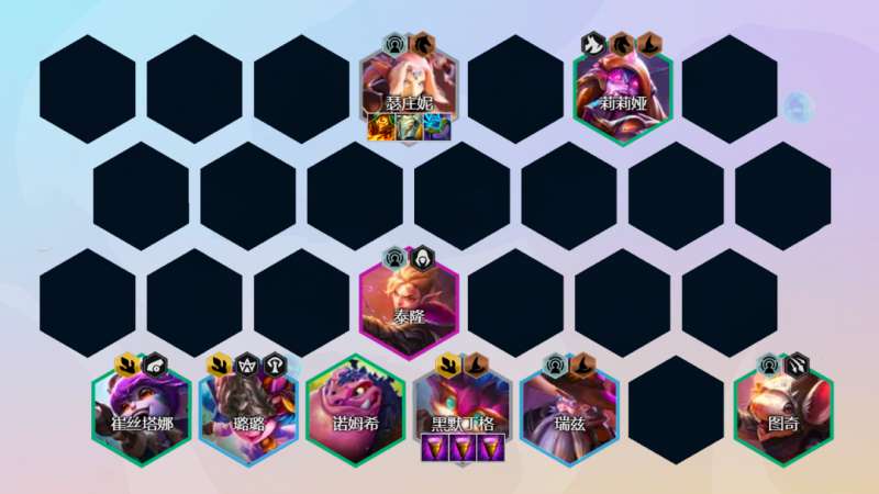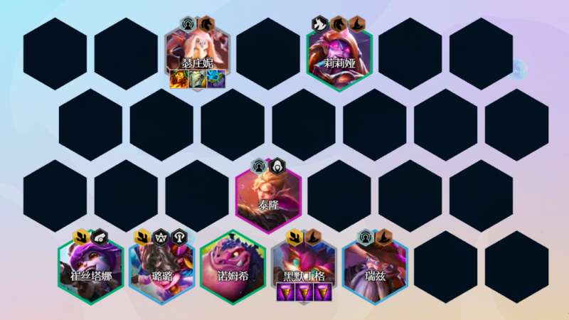 阵容组成:瑟庄妮、黑默丁格、崔丝塔娜、图奇、莉莉娅、璐璐、瑞兹、泰隆