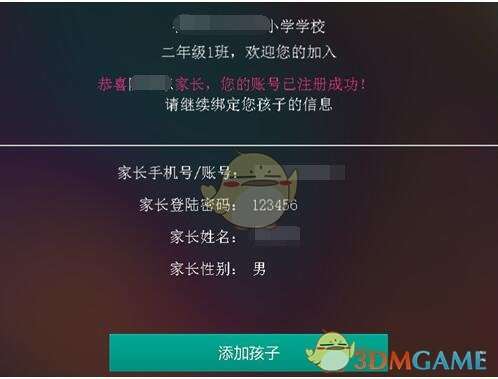 家长帐号即可注册成功,接着点击添加孩子(注册孩子帐号)。输入孩子姓名、性别、与孩子关系,设置孩子帐号密码,确认密码。点击确定。孩子帐号即注册成功,孩子帐号一般是s+家长的手机号。