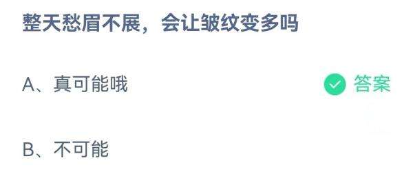 2022支付宝蚂蚁庄园8月5日的题目为:整天愁眉不展会让皱纹变多吗?真可能哦还是不可能?很多小伙伴可能还不太清楚正确答案是什么。下面小编就为大家带来了正确答案分享,感兴趣的小伙伴们快一起来看看吧!