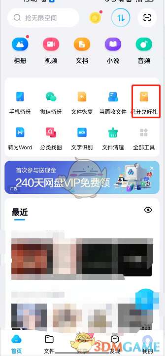 1、打开百度网盘,点击【积分兑好礼】。