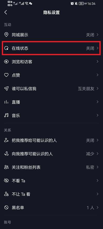 4、随后在隐私设置功能界面,就可以看到【在线状态】功能,点击打开;