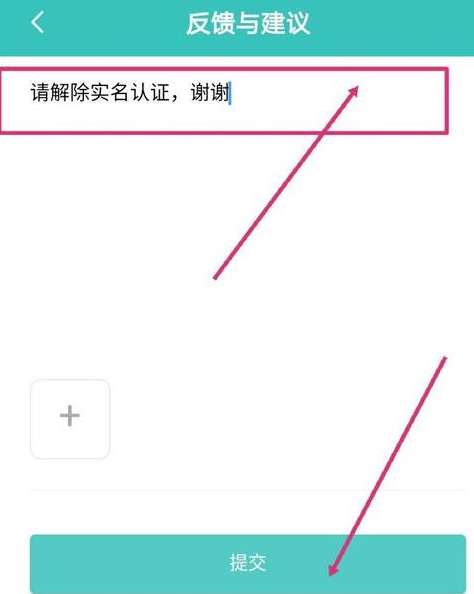 4、点击反馈与建议,可以看到输入请解除实名认证,谢谢,点击提交。