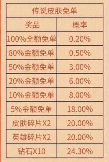 通过这两张图大家可以知道百分百免单概率只有0.2,也就是千分之二的概率,即便是百分之八十和百分之50的折扣几率也是非常低的,对于一些氪金大户来说可能是一个还不错的活动,但对于一些只想购买自己喜欢皮肤的小伙伴这个活动聊胜于无,希望大家不要上头,这种概率免单活动其实就是一个变相的抽奖活动,只是为了刺激玩家消费才推出的。