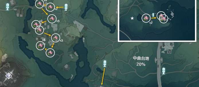 3、大家沿着下图的路线开始采集就可以了,该材料是忌炎、安可、漂泊者的突破材料,有这几个角色的玩家一定要多多收集哦。