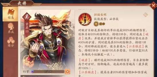 孙坚有着一个强大的特点,自身攻击和防御几乎是互补的存在,这也让孙坚即使处于前排的位置,伤害也是完全不输给队伍的主要输出角色。炙焰这个技能是能够对横排的敌人造成大量的物伤,技能释放后还会提升自身百分比的防御能力。烈日炎威也是群伤技能,除了造成大量伤害之外,还会吸取对手的防御力为己所用,这个效果是能够持续两个回合。