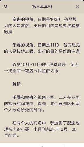 王寻的视角,日期是1110,谷丽想见的人是拉萨之眼,出行的目的是帮助许逸谷丽10月~11月的行程轨迹是:花店→找雷萨→花店→找拉萨之眼