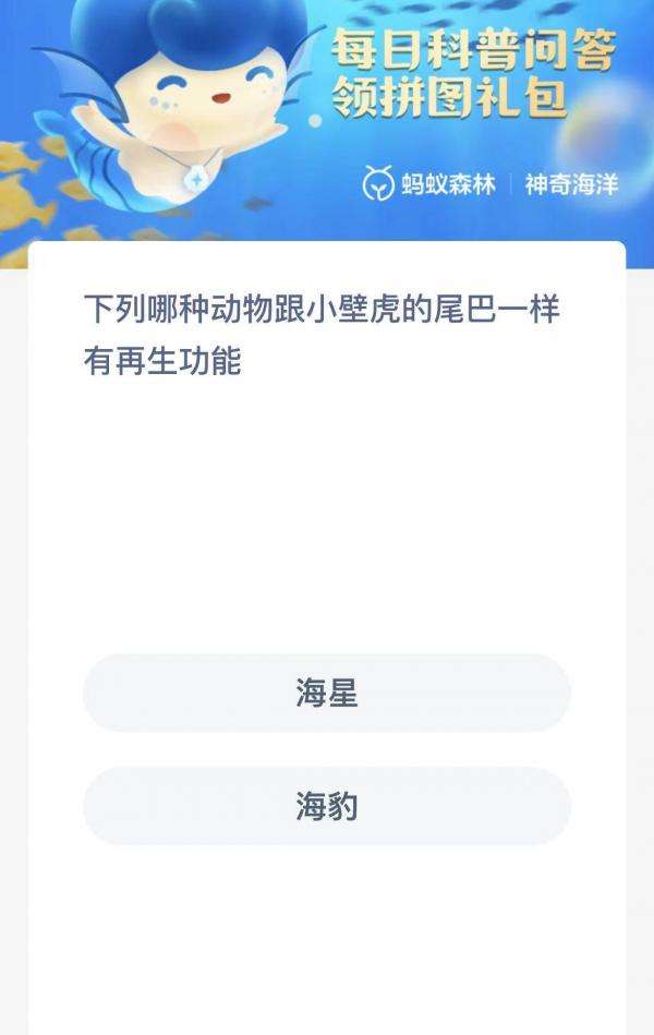 2022支付宝蚂蚁海洋7月31日的题目已经更新了,今天的题目为:下列哪种动物跟小壁虎的尾巴一样有再生功能?正确答案是什么?海星还是海豹呢?很多小伙伴可能还不太清楚。下面小编就为大家带来了正确答案分享,希望能帮助到你。