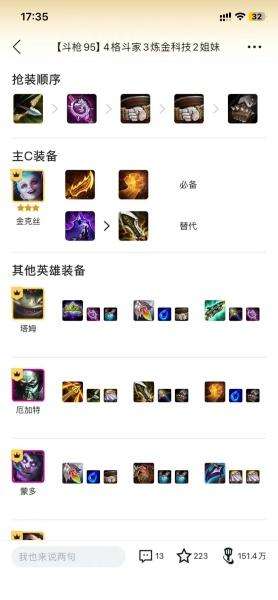 解析:金克丝厄加特分摊物理散件,金克丝留一件夜之锋刃,进场防暴毙,杰斯蒙多全肉,塔姆可以肉但可以做的偏AP一点,迦娜给个水滴极客可以变成装。