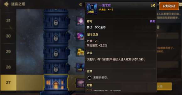 4、中期过渡:迷妄之塔通关特定层数,可获得用于过渡的称号,例如通关28层可以获得“一生之敌”称号,可通过每层奖励预览找到可获得的称号。