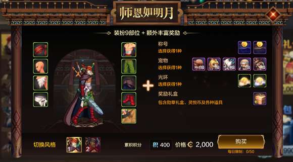5、毕业称号:目前购买商城礼包【导师套】2000点券档位时,内含一款毕业称号(二选一),同时还有宠物、光环、奖励礼包可多选一。