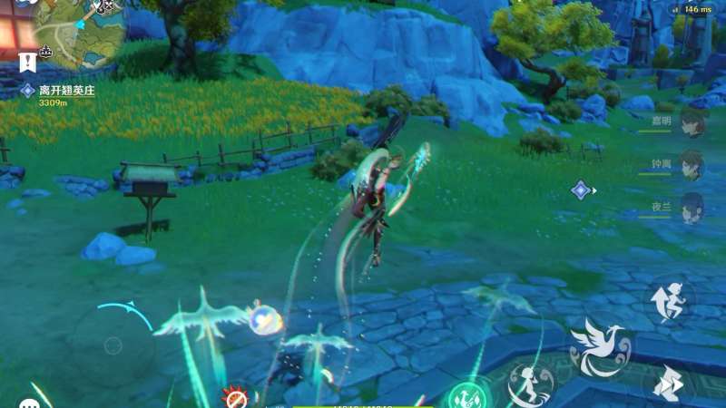 重击的距离比普攻稍微短一点,但是是独立附着弱风。风球可以无视障碍物和敌怪进行穿透,同时又能随着地面高度改变轨迹。不过与其说是改变轨迹,更像是贴地飞行。E技能让闲云进入幻化状态,往前跳三段,但这个跳并不锁敌。