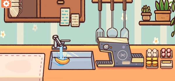 1、移动左边的水果到水龙头下,听到滴的一声则冲洗干净。